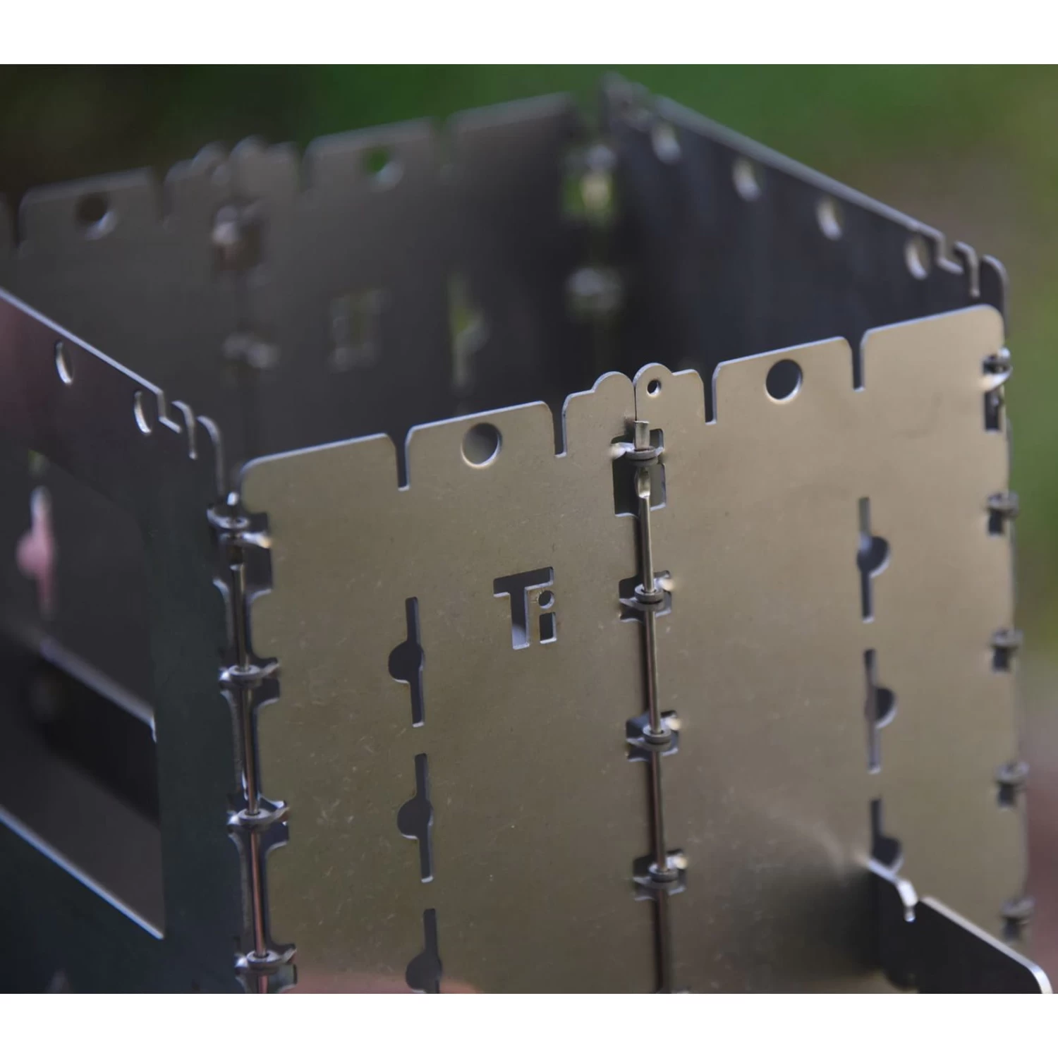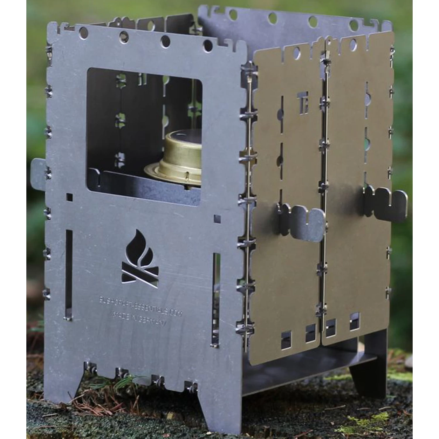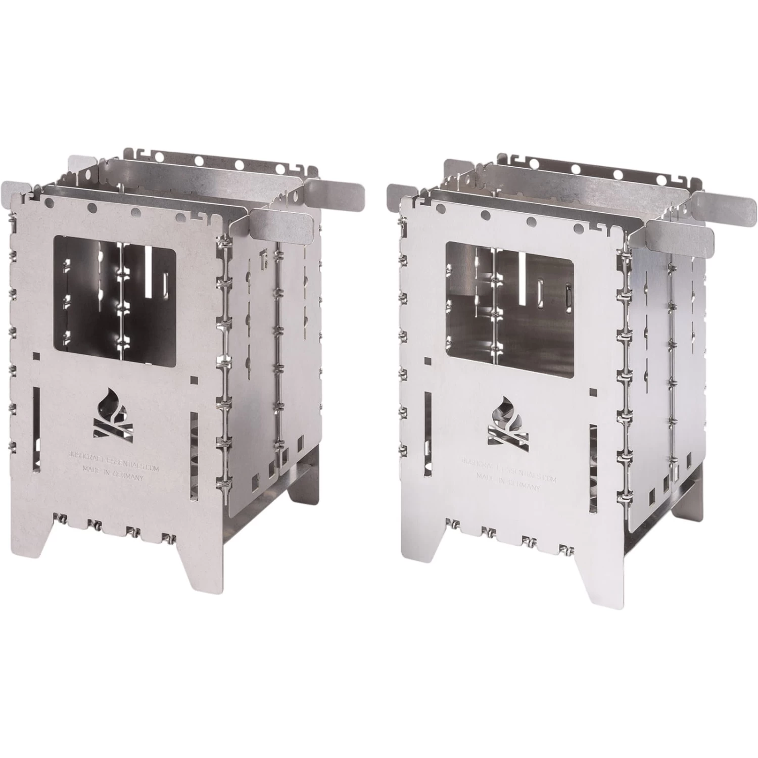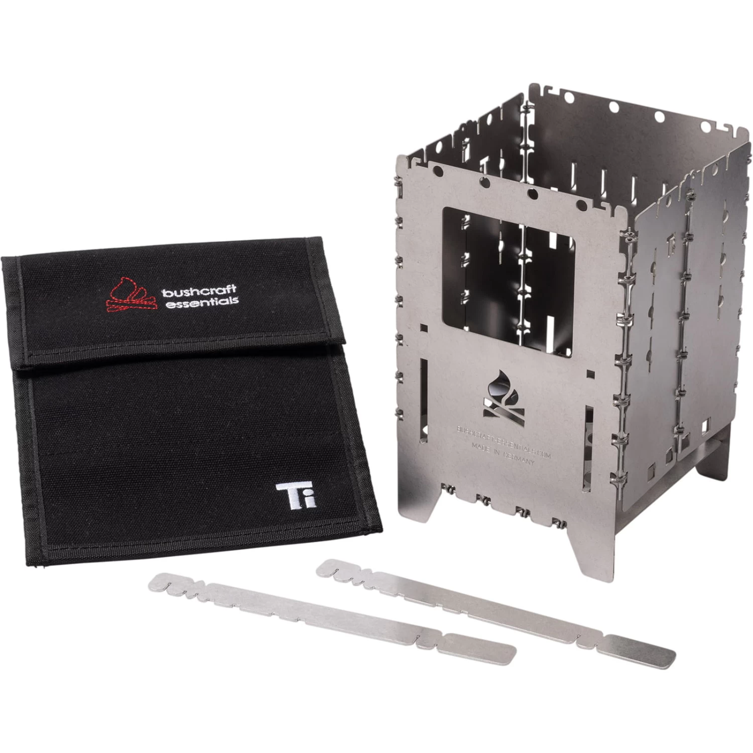 Der Bushbox XL in Titan-Ausführung von bushcraft essentials ist ein außerordentlich effizienter portabler Falt-Hobo-Kocher zum Grillen, Kochen, Wärmen. Zusammengefaltet nur ca. 1 cm dick. Perfekt für längere Outdoor-Trips, Camping, Trekking, Bushcraft, Biker, Expeditionen und und und… Unabhängig, vielfältig und einfach zu benutzen. Den Brennstoff gibt es kostenlos überall in der Natur – Zweige, Äste, Laub, Tierdung. Halteposition für Trangia Kocher. Zusammengeklappt ist dieser geniale Hobo-Ofen nur wenig dicker als 1 cm und lässt sich nahezu überall unterbringen. Der Bushbox XL Titanium wird an den Scharnieren einfach aufgeklappt und ist sofort einsatzbereit (er lässt sich auch mit Handschuhen oder klammen Händen problemlos aufbauen, was bereits auf Expeditionen unter Beweis gestellt wurde). Der Bushbox XL Titanium arbeitet nach dem Kamin-Prinzip: Luft strömt von unten in den Kocher, bringt sogar noch feuchtes Material zum Brennen und erzeugt starke Hitze, was weiter dadurch unterstützt wird, dass die Hitze im Gegensatz zu einer offenen Flamme kaum nach den Seiten abstrahlen kann und dadurch vorwiegend nach oben gelenkt wird. Der Bushbox XL Titanium ist ein Effizienzwunder. Schon mit wenigen kleinen Zweigen lässt sich Wasser in unter 4 Minuten zum Kochen bringen, Fleisch grillen, Essen zubereiten – und vieles mehr. Als Brennstoff kann neben praktisch jedem natürlichen bzw. festen Brennstoff wie Holz, Rinde, Holzkohle (sogar trockner Tierdung) auch ein Spiritusbrenner, Esbit-Tabletten oder ein Gel-Kocher verwendet werden. Durch zwei mitgelieferte Stäbe (aus Edelstahl) kann eine externe Wärmequelle (z.B. Trangia) auf jeder beliebigen Höhe in der Bushbox XL plaziert werden. Diese Stäbe lassen sich auch auf der Oberseite des Kochers einlegen, so dass auch kleine Gefäße erhitzt werden können. Die mitgelieferten, äußerst variabel einsetzbaren Topfauflagen können alternativ verwendet werden als Höhenregulierung beim Einsatz anderer Wärmequellen, Haltestäbe zum Transport oder Versetzen des heißen Kochers und Halterung für den Trangia-Brenner.