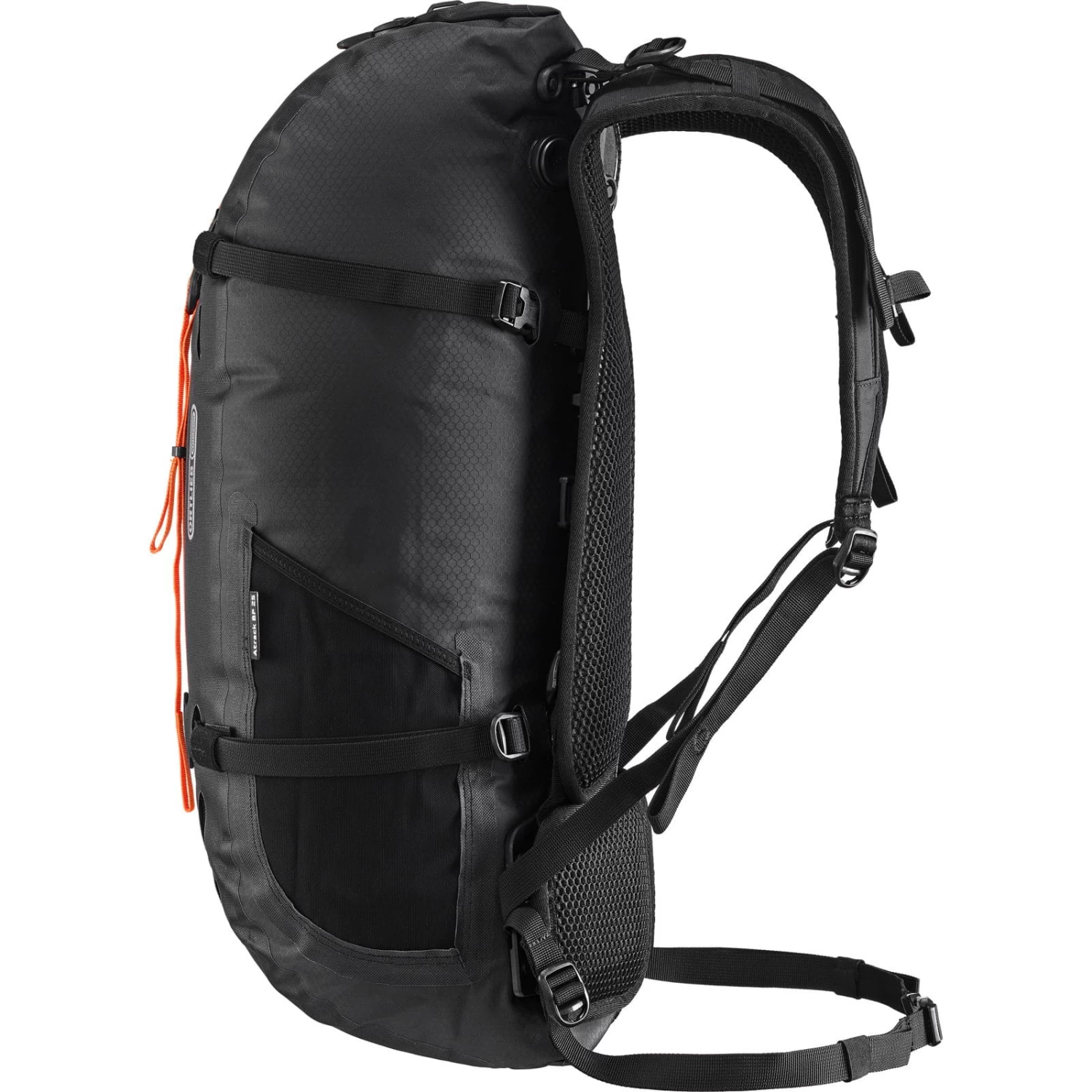 | Merkmale | abnehmbarer Tragegriff oben, diverse Materialbefestigungspunkte, einfacher Bauchgurt, höhenverstellbarer Brustgurt, kompatibel mit speziellem Trinksystem (ORTLIEB Atrack Hydration System, bei Verwendung ist der Rucksack nicht unterwasserdicht), Kompressionriemen innen, Kompressionsriemen vertikal, Rückenöffnung mittels wasserdichten TZIP Reißverschluss, Schlüsselhalterung, seitliche Kompressionriemen können am Rücken verstaut werden, seitliche Kompressionsriemen, verstellbare Rückenlänge, vier Reißverschlusstaschen innen, zahlreiche Befestigungsmöglichkeiten mit optionalem Attachment Kit, zwei elastische Seitentaschen |