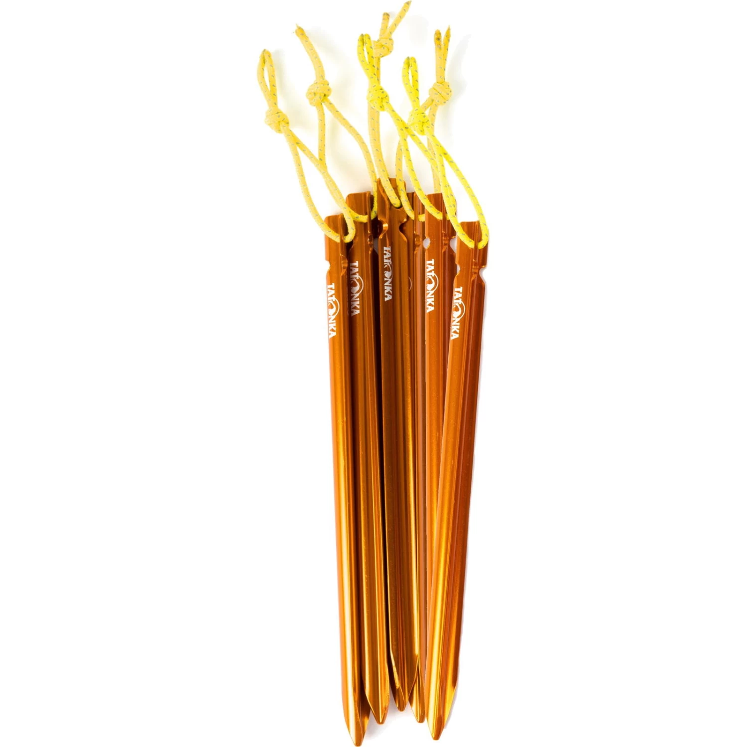 Der leichte Aluminium-Zelthering Tent Peg Pro 15 von Tatonka besitzt ein Y-Profil. In gut sichtbarem Orange und mit Schlaufe zum Herausziehen. Erhältlich im 6er-Pack.